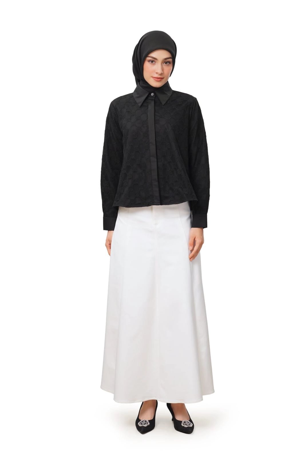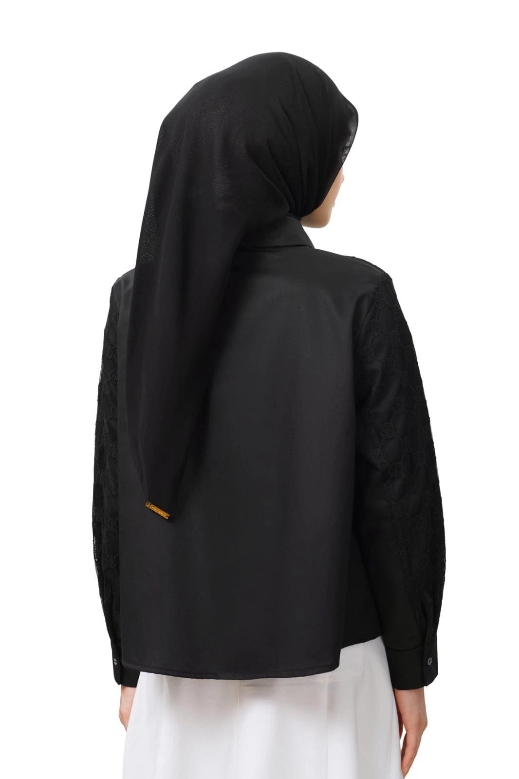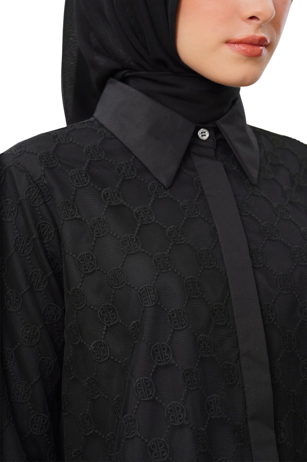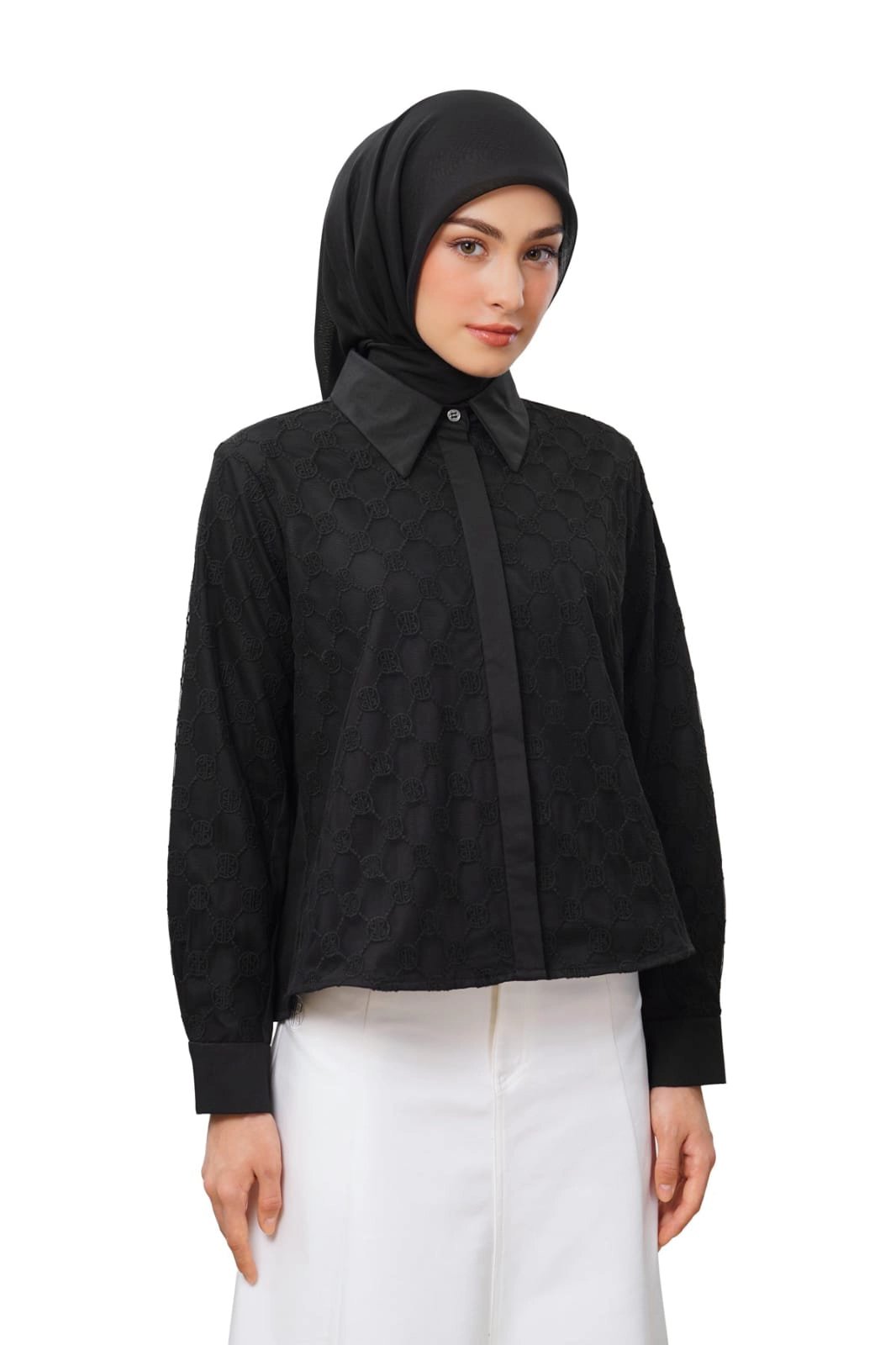 Crafted from a lace monogram and cotton blend, this crop shirt offers a refined textured finish. It also brings a modern twist to a timeless essential with its pointed collar, hidden placket, and long sleeves with buttoned cuffs.