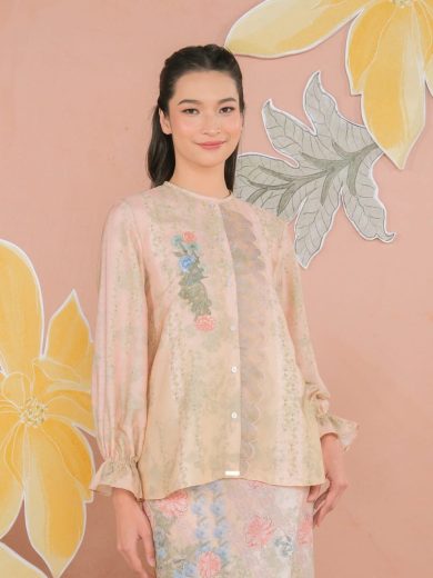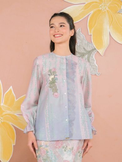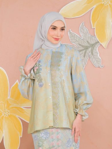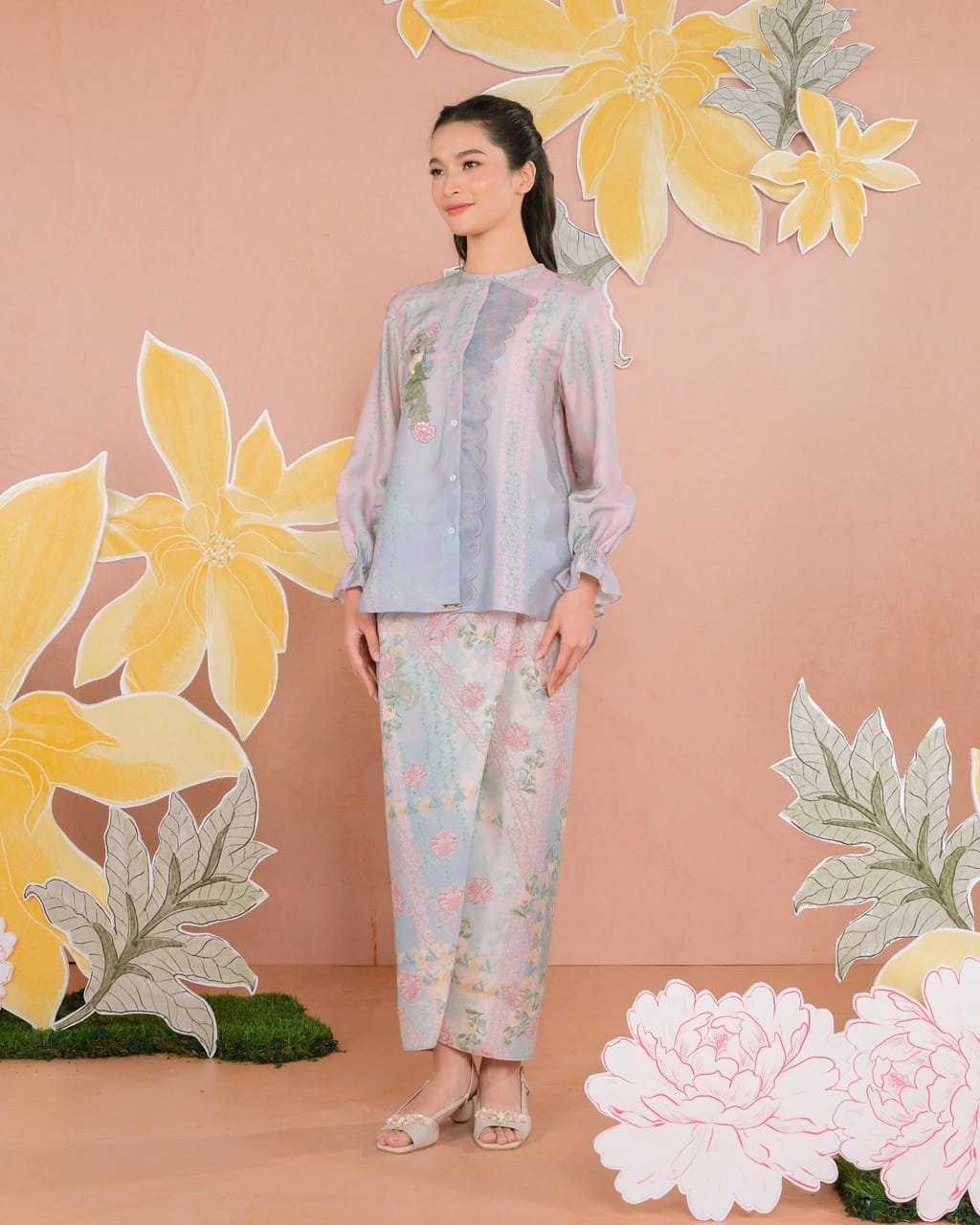 Terdapat aksen organza printing yang tepinya di bordir outline pada depan plaket kancing